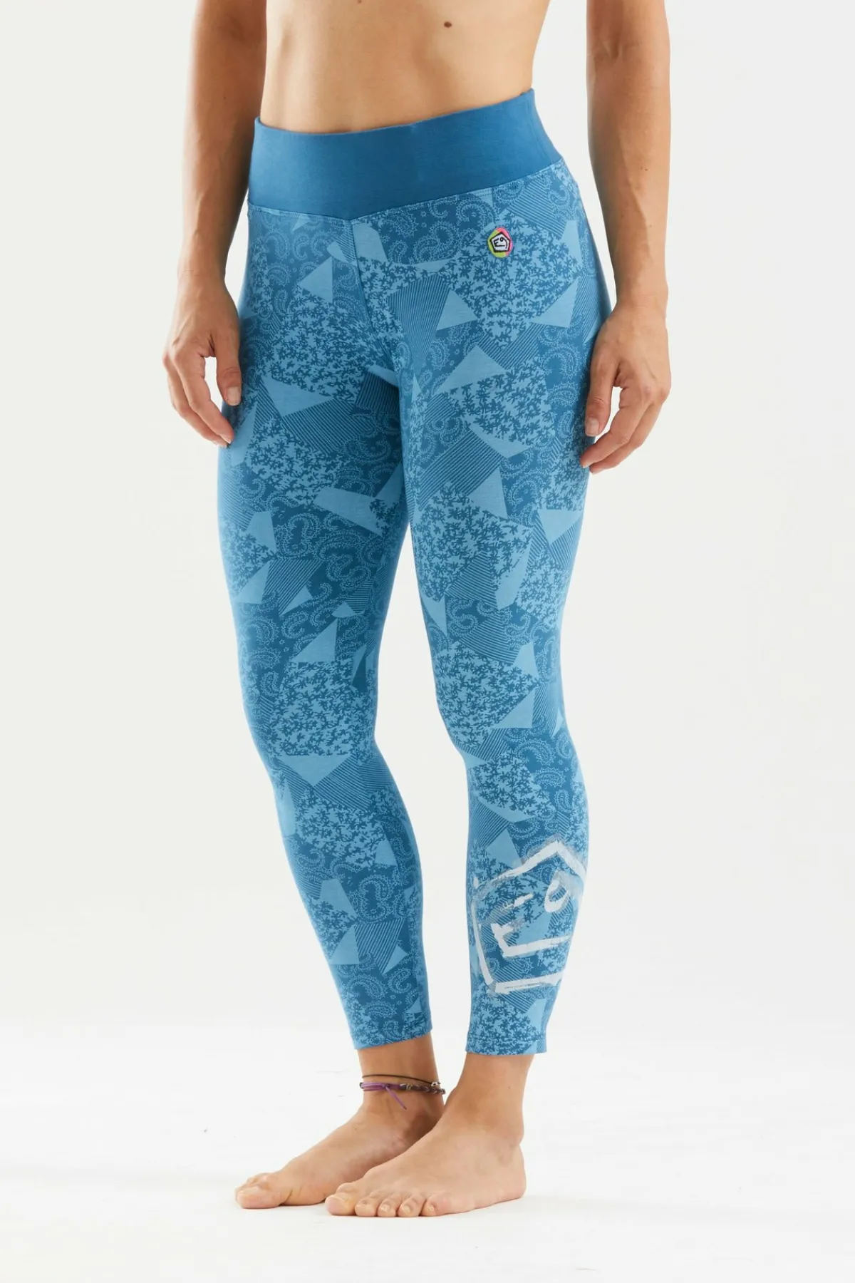 7/8-Leggings Aus Bedrucktem, Bielastischem Bio-Baumwollstoff. Originaldruck Unten Links. Stickerei Am Linken Vorderbein. Maximaler Komfort Und Mobilität. Schlanke Passform. Hergestellt In Italien.