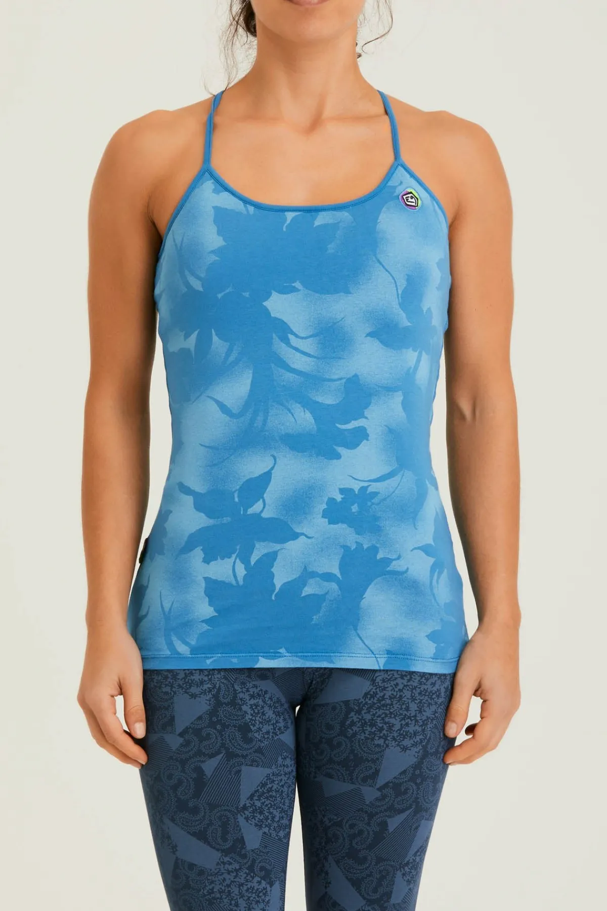 Integrierter Tank-Top-Bh Aus Bielastischem Bedrucktem Stoff. Abnehmbare Polsterung. Stickerei Auf Der Herzseite. Druck Auf Der Rückseite. Guter Komfort. Hergestellt In Italien.